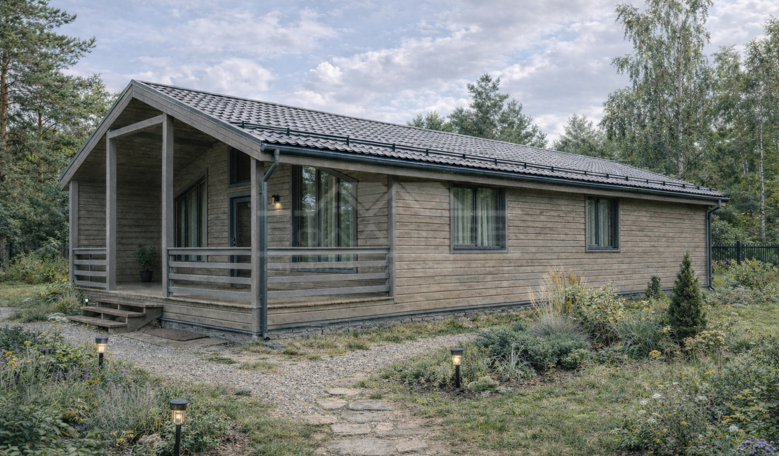 Вашему вниманию предсавлен уютный и современный дом для постоянного проживания Экзальт 141. Данный проект включает в себя три спальни, совмещенный санузел, гардероб, прихожую, котельную, большую кухню-гостиную на 32 м2, а так же терасу на 22м2 и крыльцо.