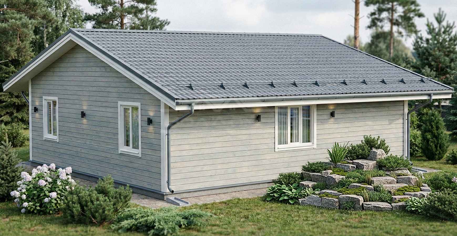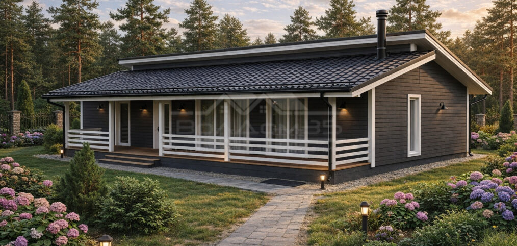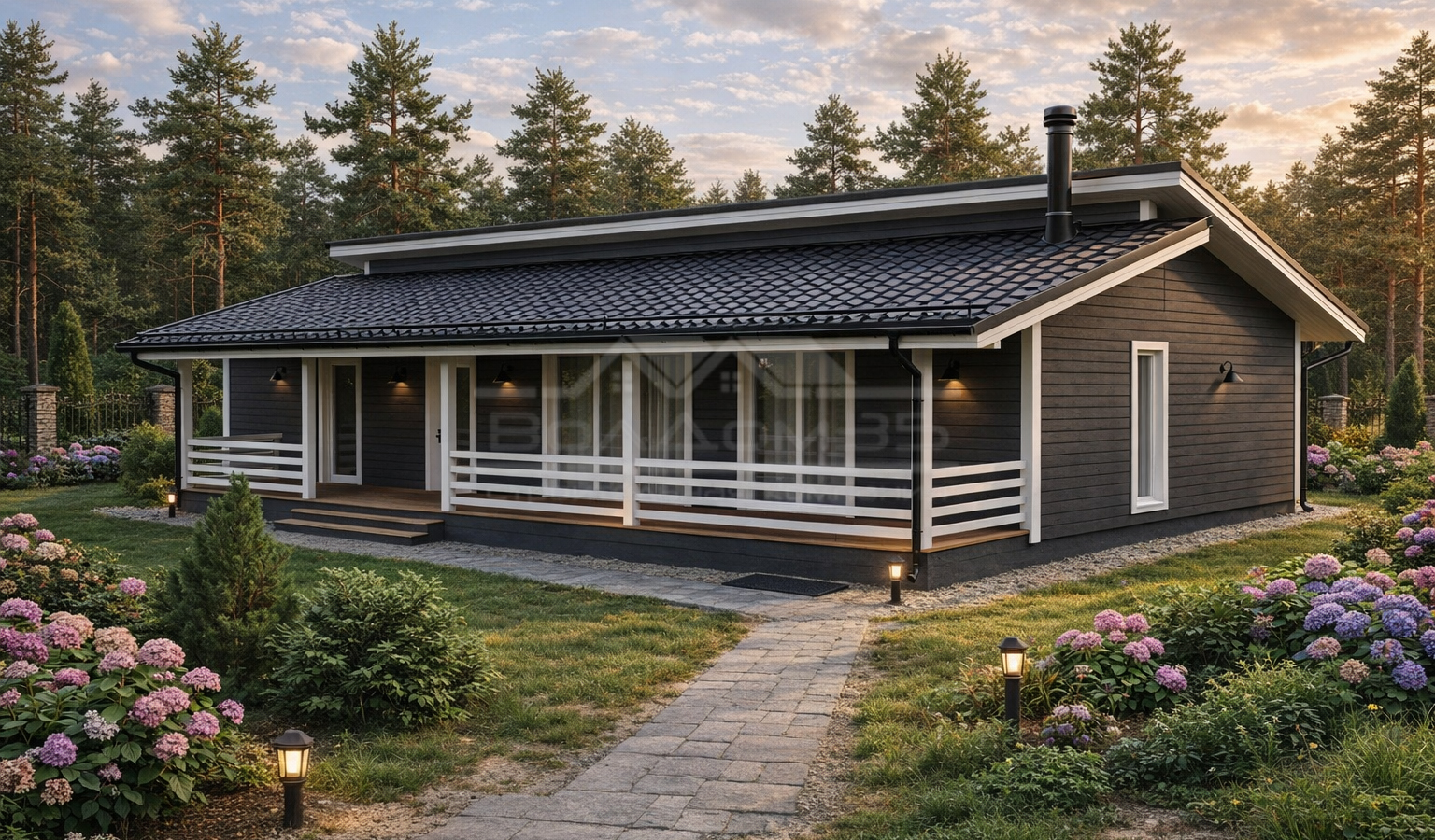 Вашему вниманию предсавлен уютный дом для постоянного проживания Мистик 100. Данный проект включает в себя две спальни, совмещенный санузел, котельную, большую кухню-гостиную на 34 м2, а так же террасу.